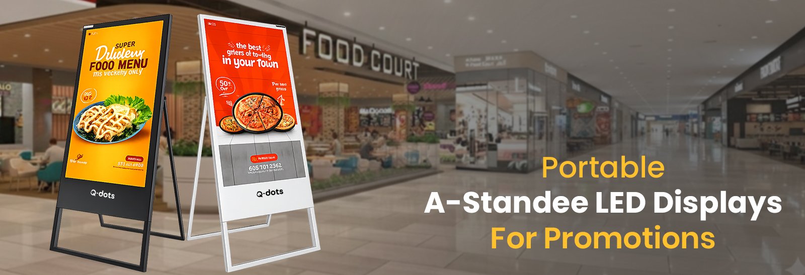 hoosing the best A floor standee displays in Coimbatore helps businesses attract walk-in customers and promote offers effectively in high-traffic indoor spaces. A floor standee displays are widely used in retail stores, showrooms, malls, supermarkets, offices, exhibitions, and promotional areas to showcase advertisements, product highlights, and brand messages. These displays offer bright visuals, sharp resolution, and smooth content playback, ensuring advertisements remain clear and eye-catching under indoor lighting conditions. Businesses in Coimbatore prefer A floor standee displays because they are cost-effective, portable, space-efficient, and easy to update, making them ideal for flexible and ongoing promotions. From compact standees to larger digital display units, A floor standee solutions enhance visibility without permanent installation. With expert consultation, professional setup, and reliable after-sales support, Qdots Displays delivers some of the best A floor standee display solutions in Coimbatore, tailored to meet diverse commercial and advertising needs.